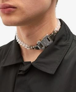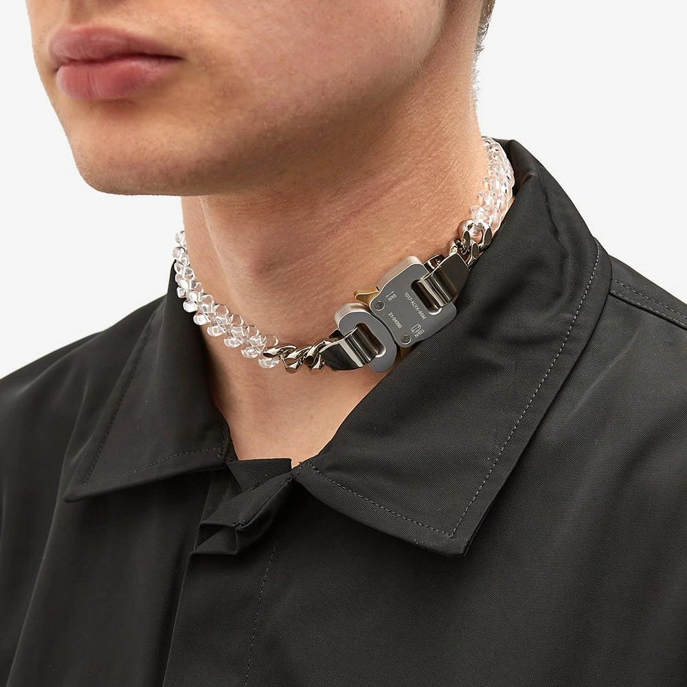 1017 ALYX 9SM is renowned for its statement pieces- and it shines through this necklace. Transparent nylon links contrast against silver brass- in a chunky style. Then, it comes complete with the brand’s iconic rollercoaster buckle and subtle engraved branding.
