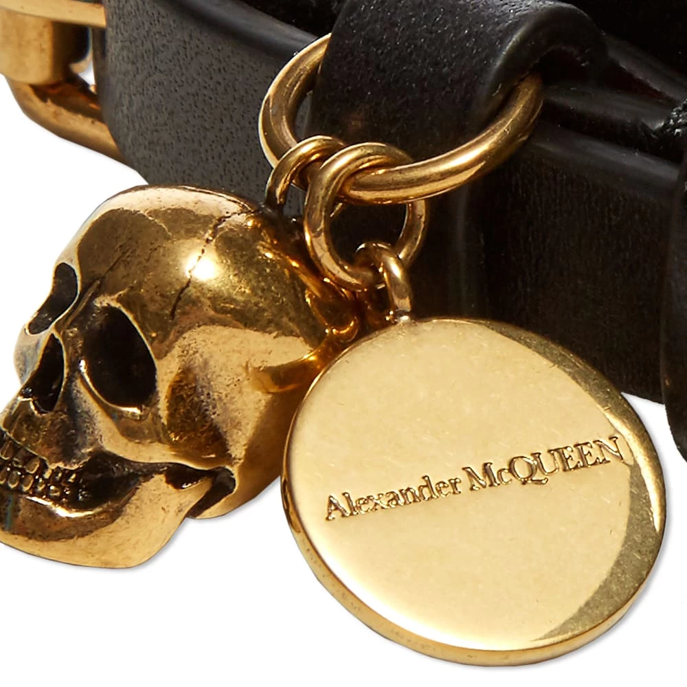 Combining high-end luxury with gothic aesthetics, this double wrap skull bracelet from Alexander McQueen adds a dark edge to any outfit. Its calfskin leather construction showcases premium Italian craftsmanship, while gold-toned metal hardwares and a skull charm embellish the accessory with macabre flair.
