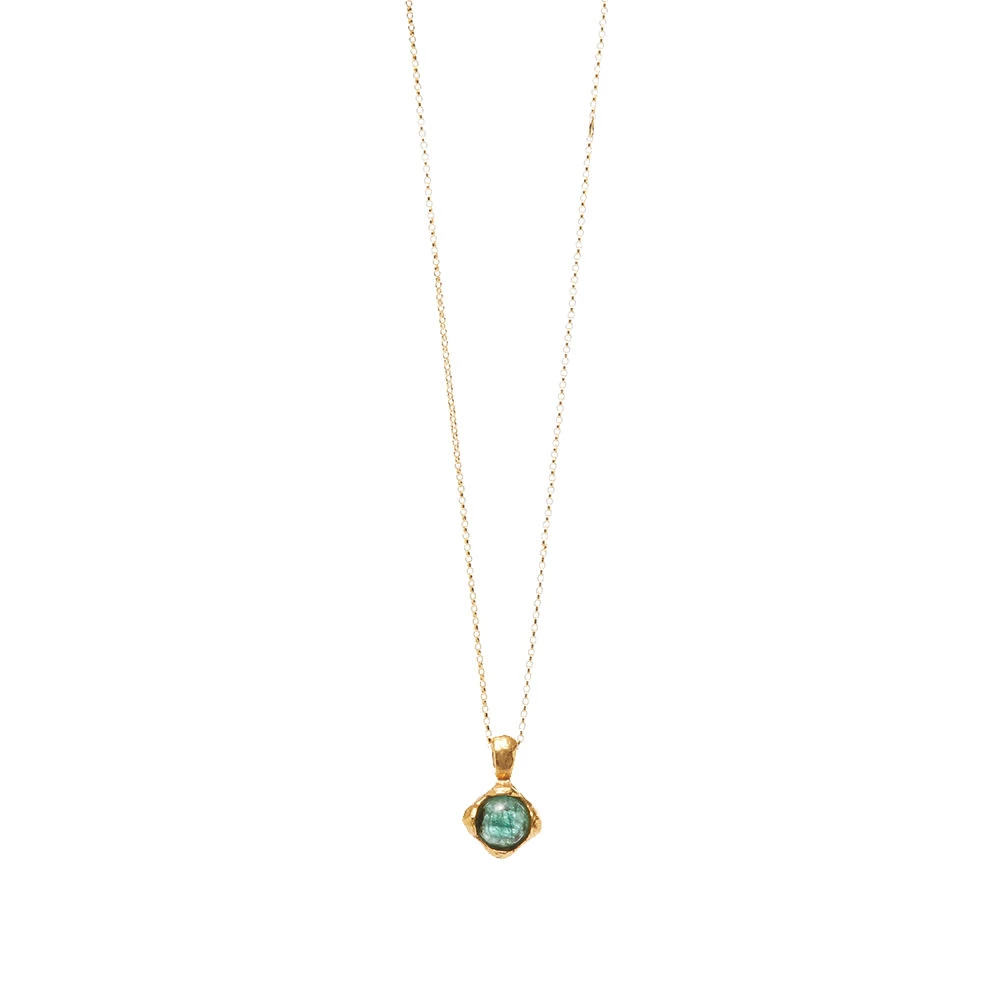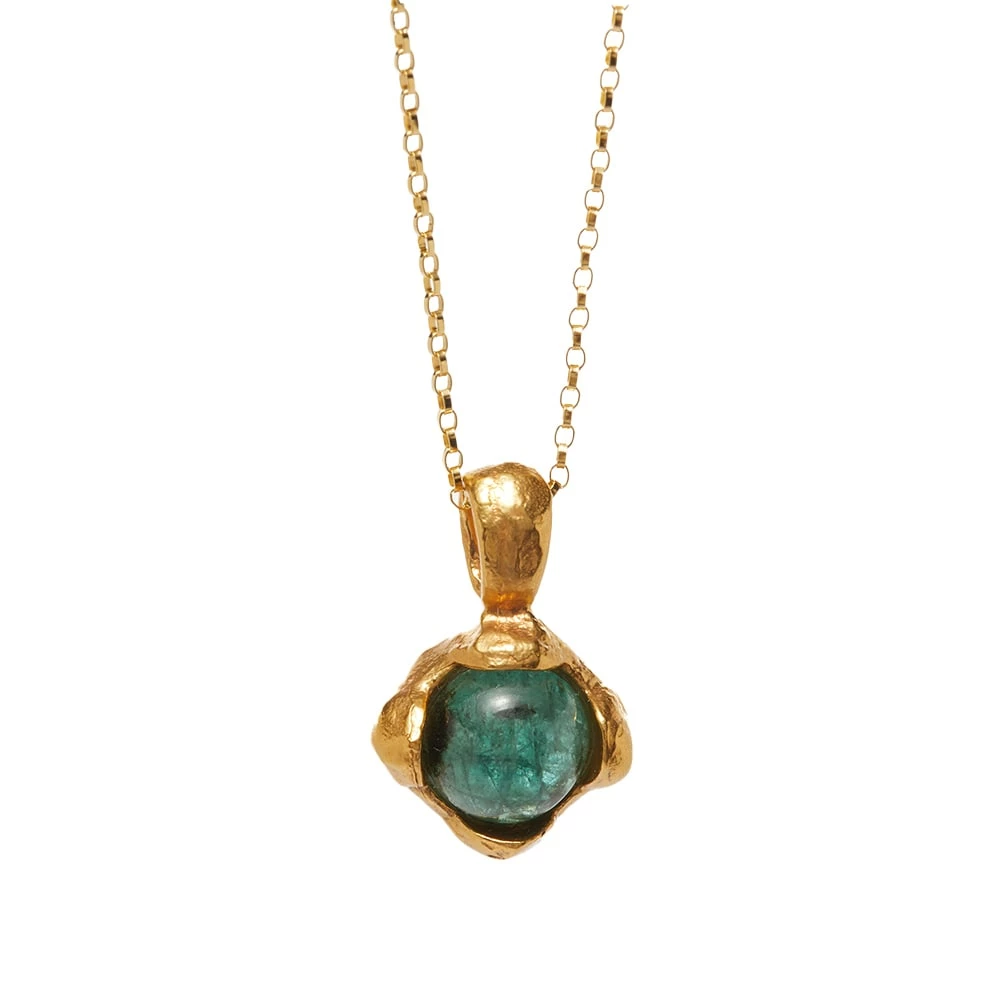 Handcrafted from 24 karat gold-plated bronze, in Hatton Garden, London, this eye of the storm necklace from Alighieri is sure to make a statement. It shows off a and green emerald pendant with a clasp fastening at the back.