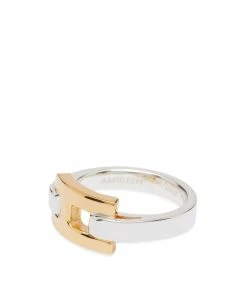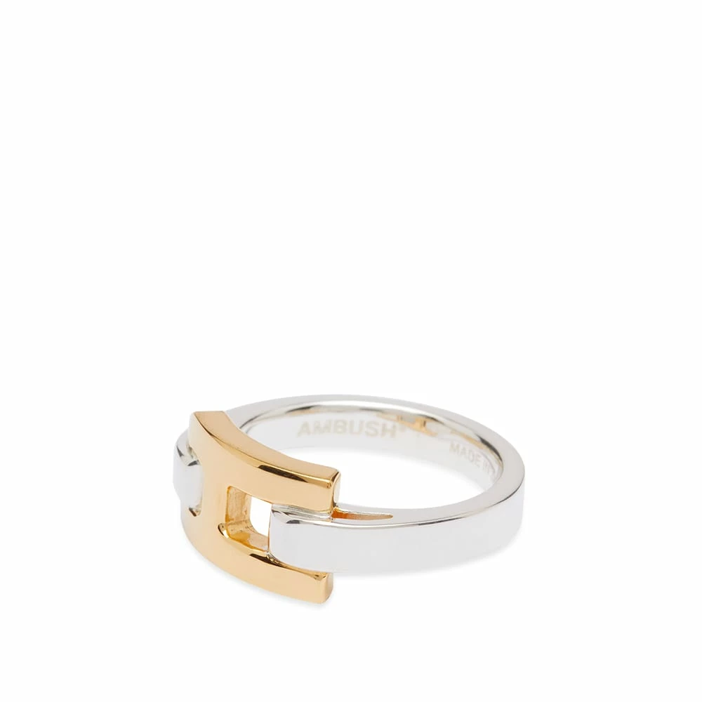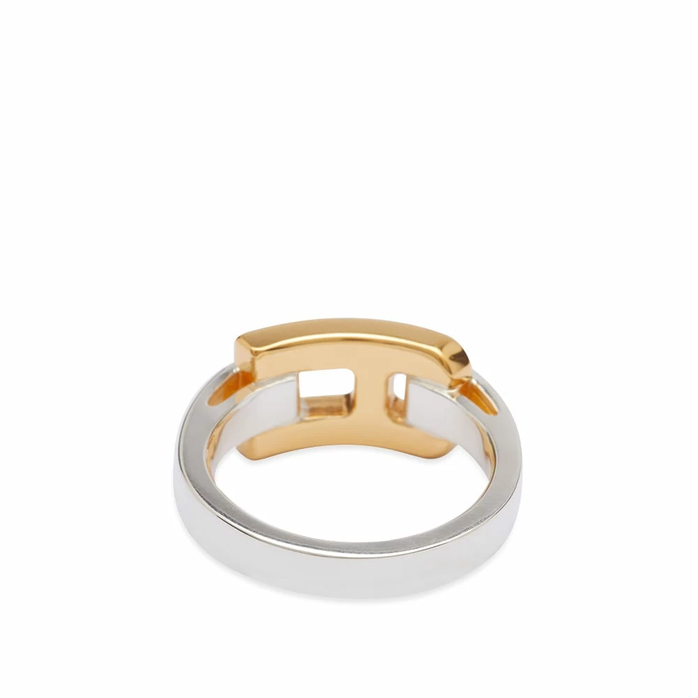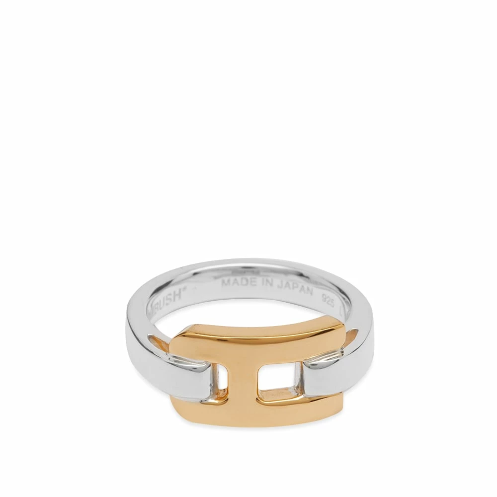 Inspired by structural hardware detailing, AMBUSH’s creations are easily recognisable. Interlocking elegantly, the ring’s A-shaped links mould a chunky band withone also carrying an engraved logo.