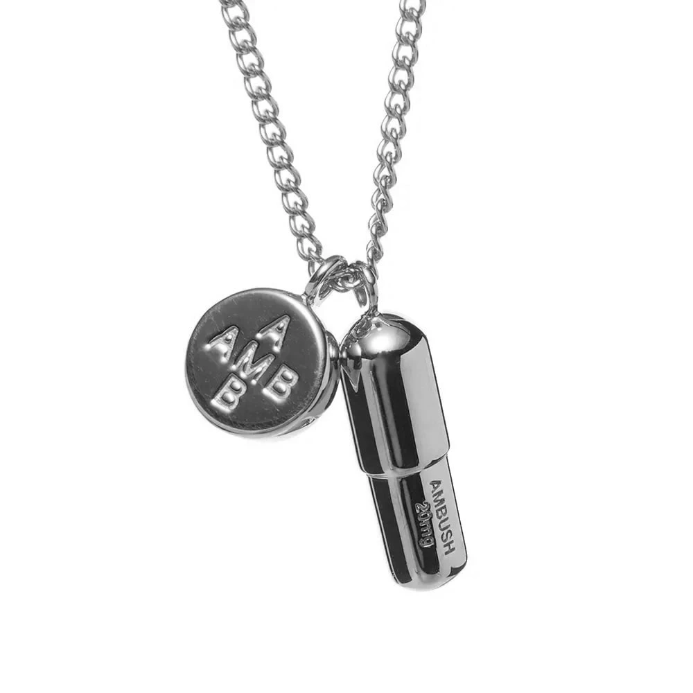 Make sure you remember your meds with the pill necklace. Founded in 2008, Tokyo brand Ambush is renowned for creating clothing and accessories that are genre-defying. The silver pill charm necklace is an ironic piece of jewellery to add to your daily look, the small pill charm is engraved with the brand’s name with a medical amount engraved underneath. The pill is accompanied with a small circle pendant with the brand’s logo engraved on it.