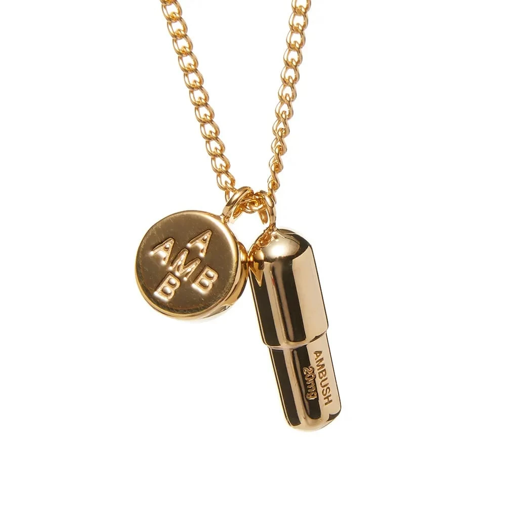 Make sure you remember your meds with the pill necklace. Founded in 2008, Tokyo brand Ambush is renowned for creating clothing and accessories that are genre-defying. The golden pill charm necklace is an ironic piece of jewellery to add to your daily look, the small pill charm is engraved with the brand’s name with a medical amount engraved underneath. The pill is accompanied with a small circle pendant with the brand’s logo engraved on it.