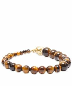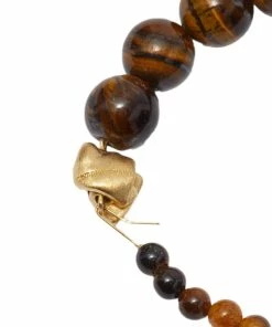 Completed Works’ sculptural jewellery is always a conversation starter. This bracelet is from the river-inspired Tidelands collection. A string of tiger eye beads vary and transform in size as they move around the wrist, mimicking the flow of water, back and forth. A 14k gold plated organic form closes things in.