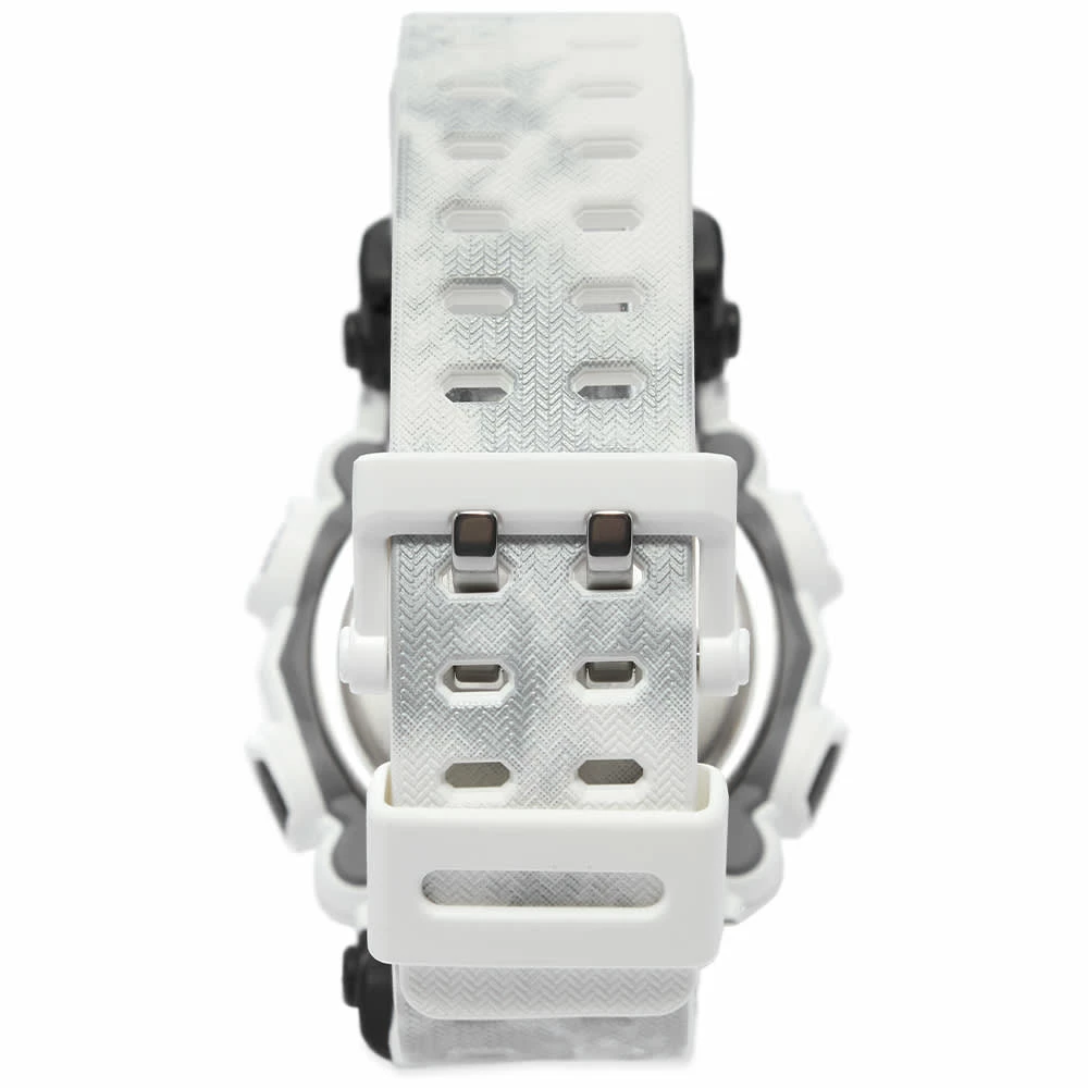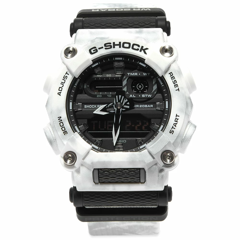 Ready for all your outdoor adventures, this GA-900 watch arrives straight from G-SHOCK’s Snow Camo series. Showcasing a frosty white and grey pattern with a black dial, it’s crafted from sturdy resin and features a mineral glass face. It’s also shock-resistant and benefits from a multi-function alarm system.