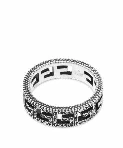 Gucci combines classic filigree detailing with geometric branding to create this ring’s cut-out design. A repeat of the fashion house’s angular G motif forms the sterling silver band, delicately engraved and oxidised for an antiquated finish.