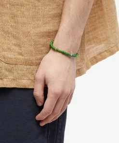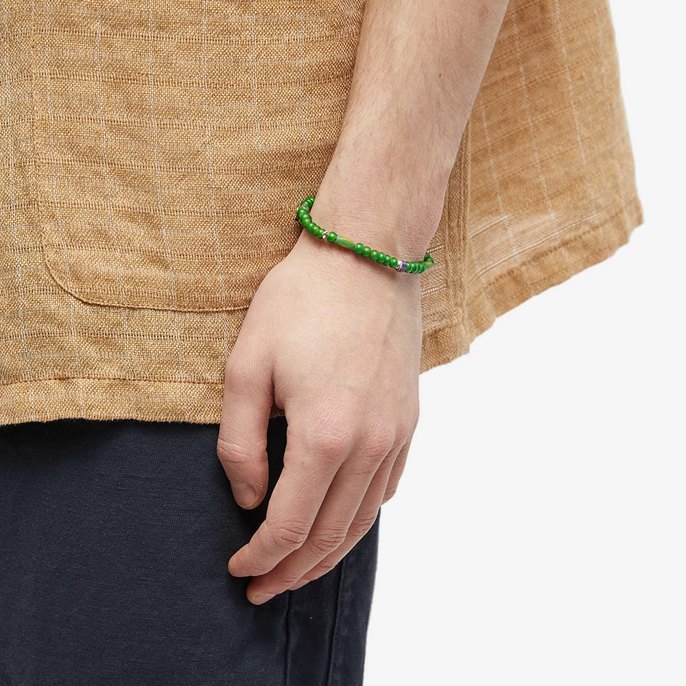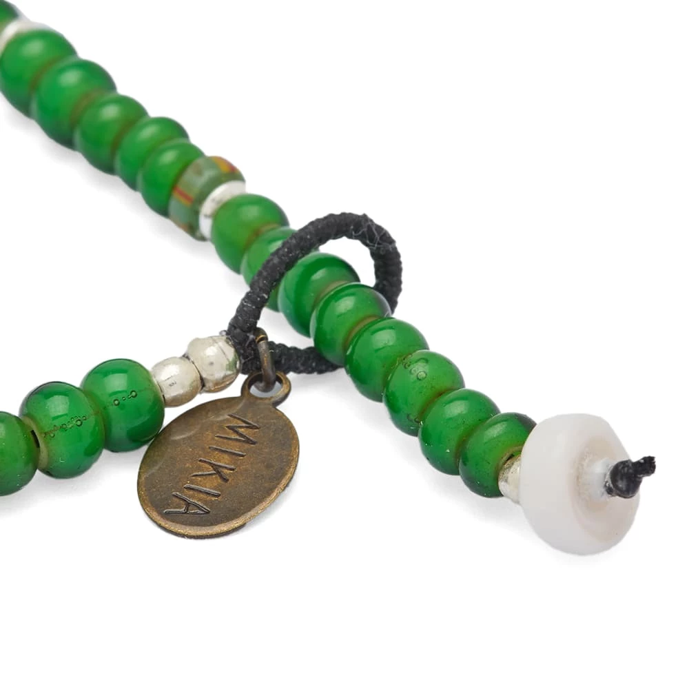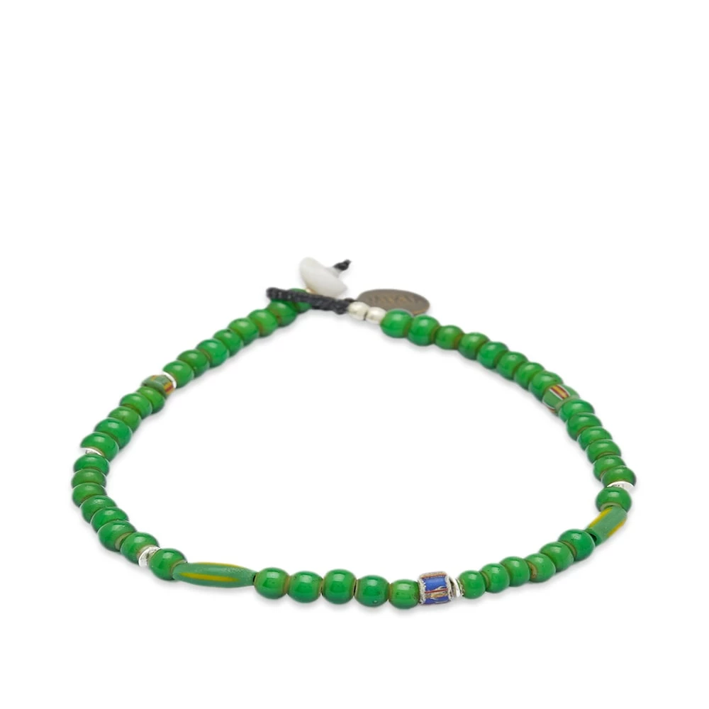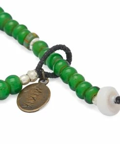 Mikia uses the vibrant tones to brighten your wrist with this bracelet. Made in Japan, the stone’s unique green colourways are complemented with delicate glass beads. Its waxed cord and gold button clasp seal in its authentic craftsmanship.