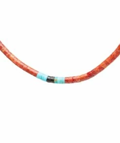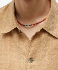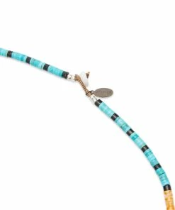 Mikia uses vibrant tones to brighten your neckline with this necklace. Made in Japan, the stone’s unique coral and turquoise colourways are complemented with delicate glass beads. Its waxed cord and gold button clasp seal in its authentic craftsmanship.