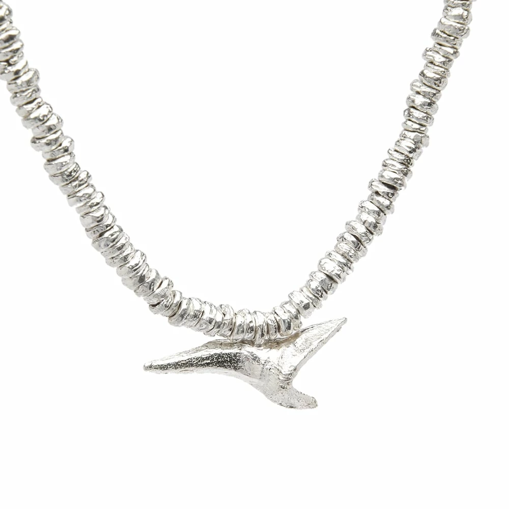 In order to challenge traditional methods of creating jewellery, Canadian brand Pearls Before Swine works with precious metals and pearls in a new way. The mares necklace is a total 90s nostalgic throwback. This necklace features a sterling silver tooth as a pendant, whilst the necklace is reminiscent of beach necklaces.