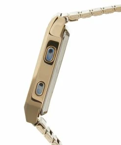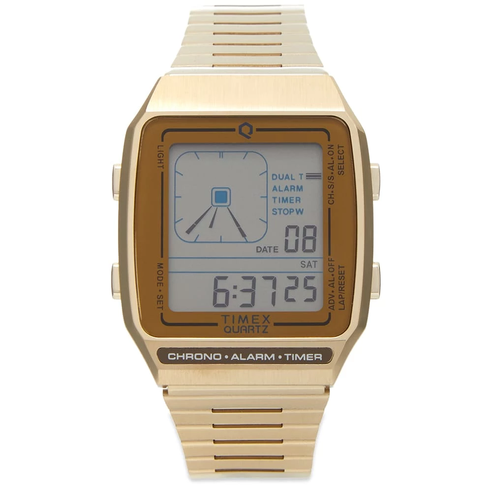 Timex looks to the archives to inspire these Q Timex LCA, modelling it on a watch that debuted in the late ‘80s. The gold-tone, stainless-steel case is updated, though the model’s large digital display, handy features — a timer, an alarm and a stop watch — and single-bulb backlight all remain.
